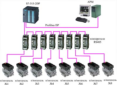 Система автоматизации построена на базе контроллера SIMATIC S7-300 с центральным процессором CPU 315-2DP. Связь с частотными преобразователями пылепитателей осуществляется по сети PROFIBUS DP.